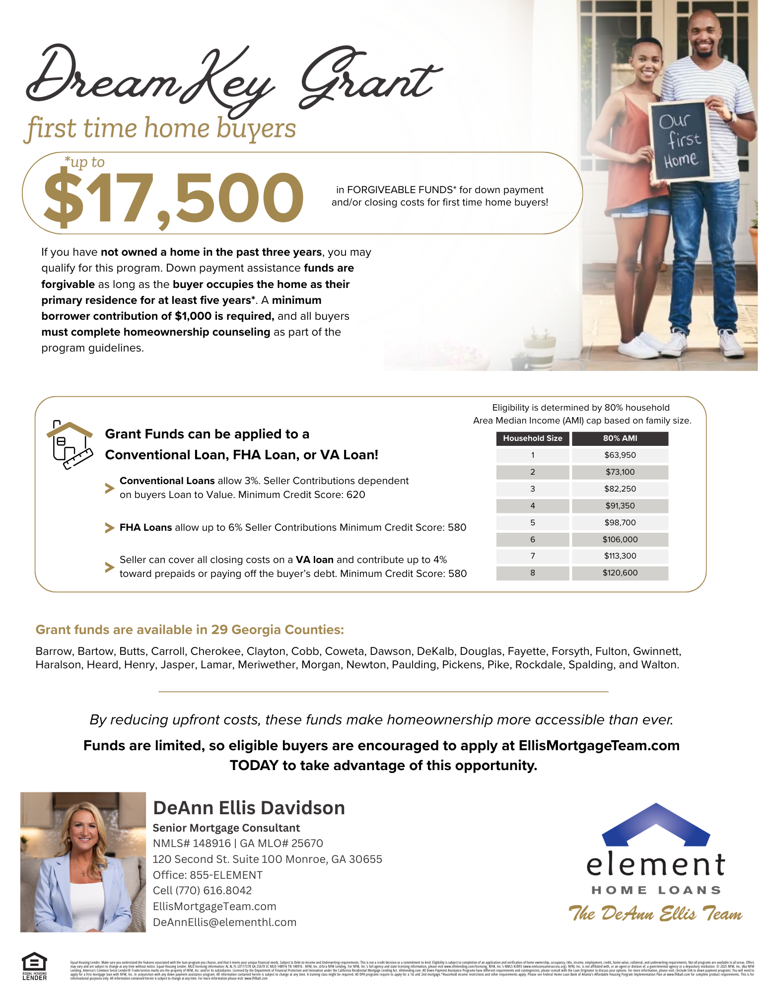 The Dream Key Grant Program was created to make homeownership more accessible by reducing upfront costs for qualified Georgia buyers. With multiple grant options available, eligible borrowers may receive up to $20,000 in forgivable funds to use toward their down payment and/or closing costs.