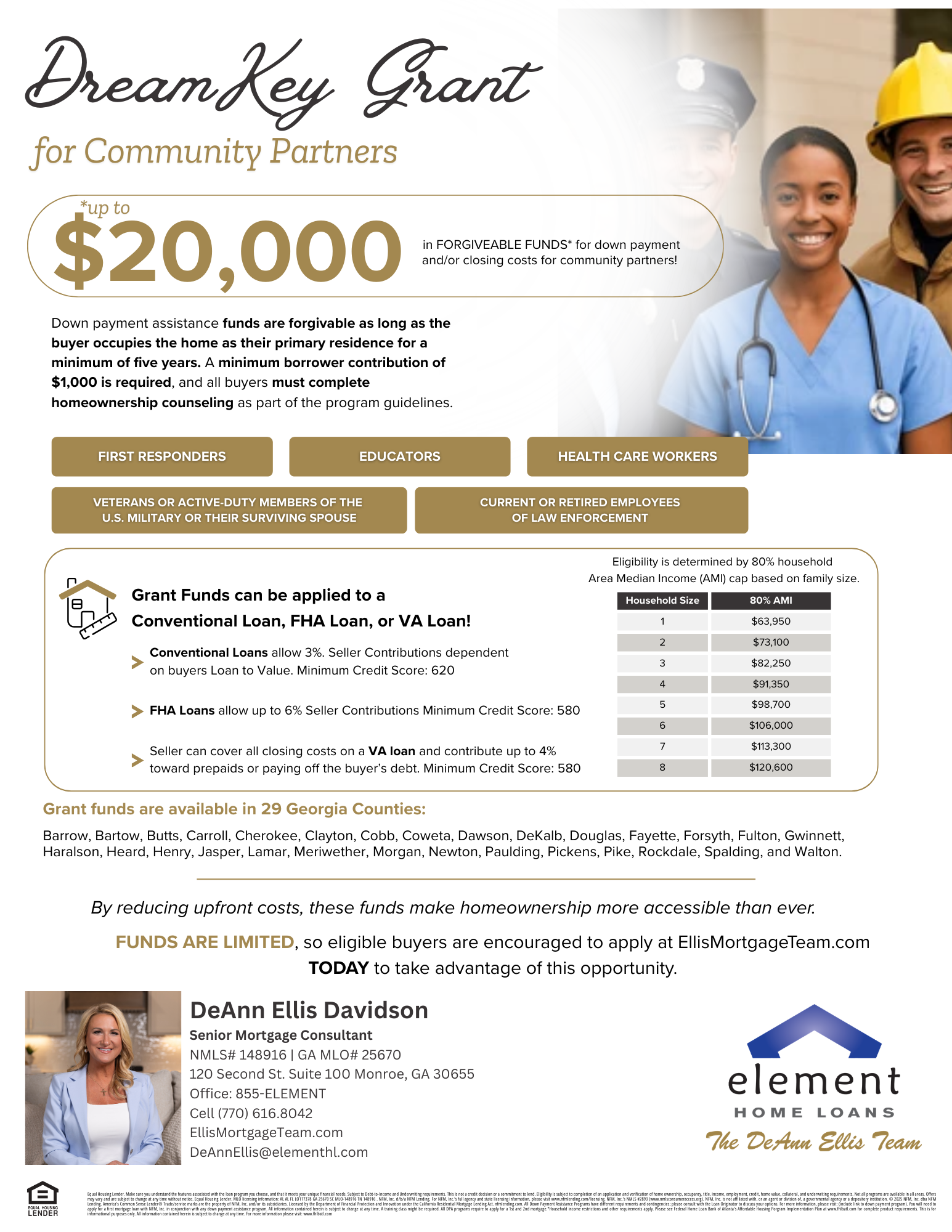 Provides up to $20,000 in forgivable down payment and/or closing cost assistance for eligible community professionals, including current or retired employees of law enforcement, education, healthcare, fire departments and other first responders, as well as veterans, active-duty U.S. military members, and surviving spouses. Eligibility is based on an 80% Area Median Income (AMI) household income cap.